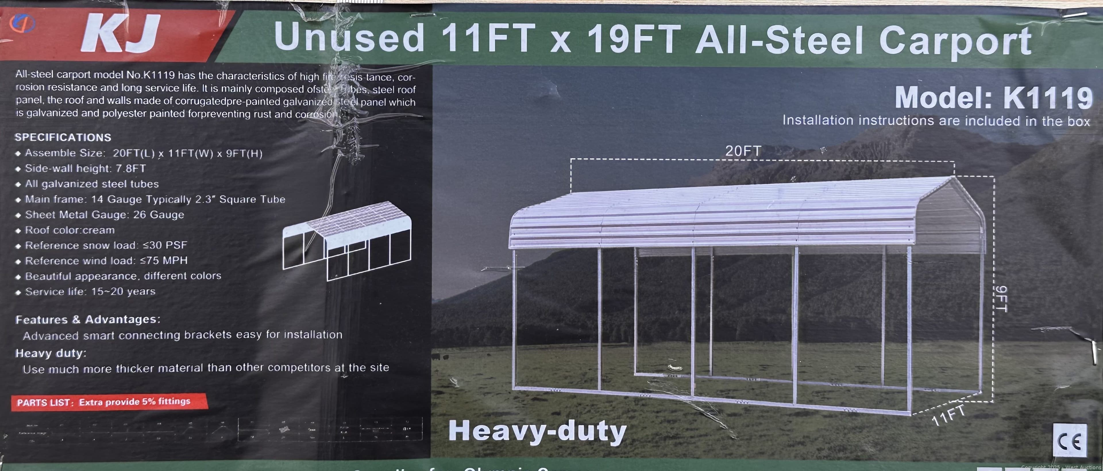 2025 KJ 11'x19' Heavy-Duty All-Steel Carport Model K1119 (Unused) | West Auctions