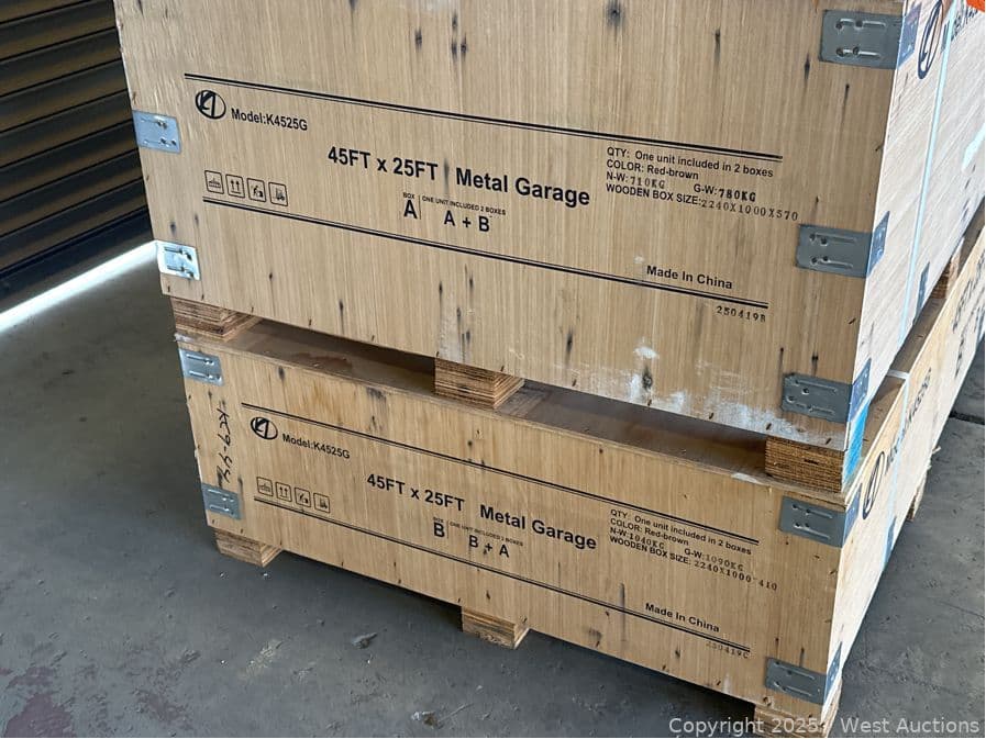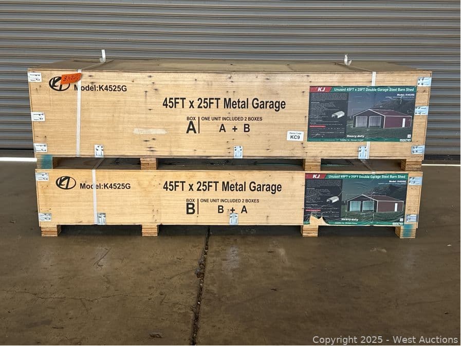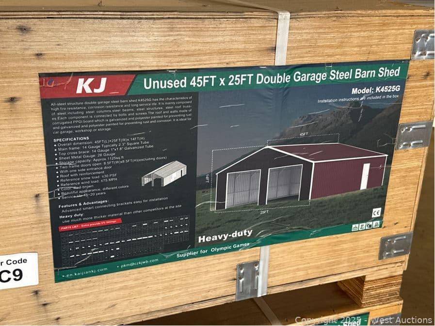 2025 KJ 45'x25' Heavy-Duty Double Garage Steel Barn Shed Model K4525G (Unused) | West Auctions