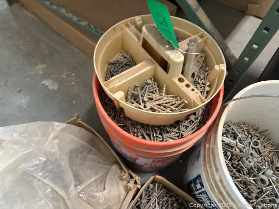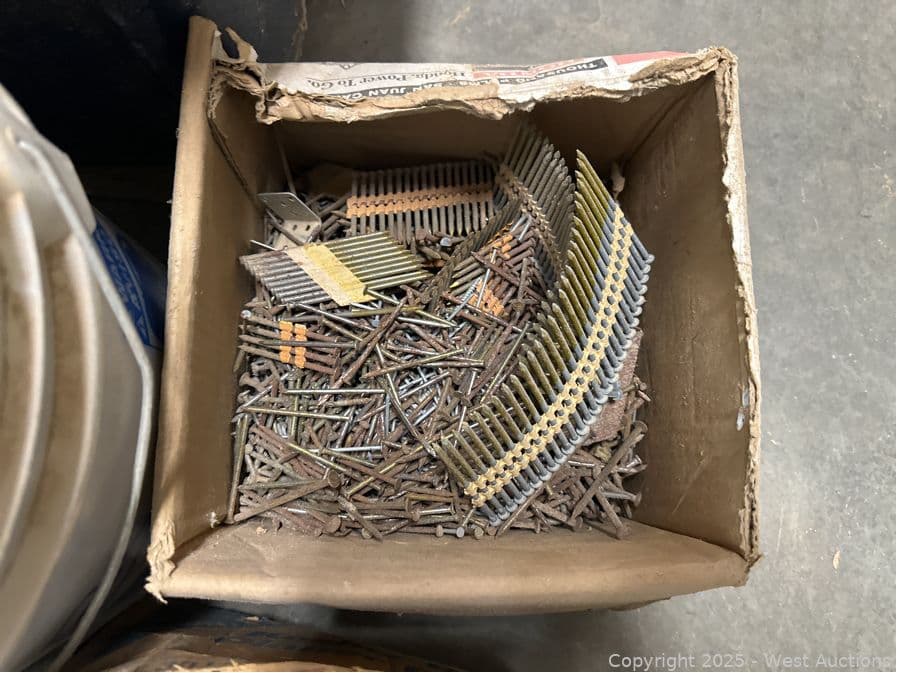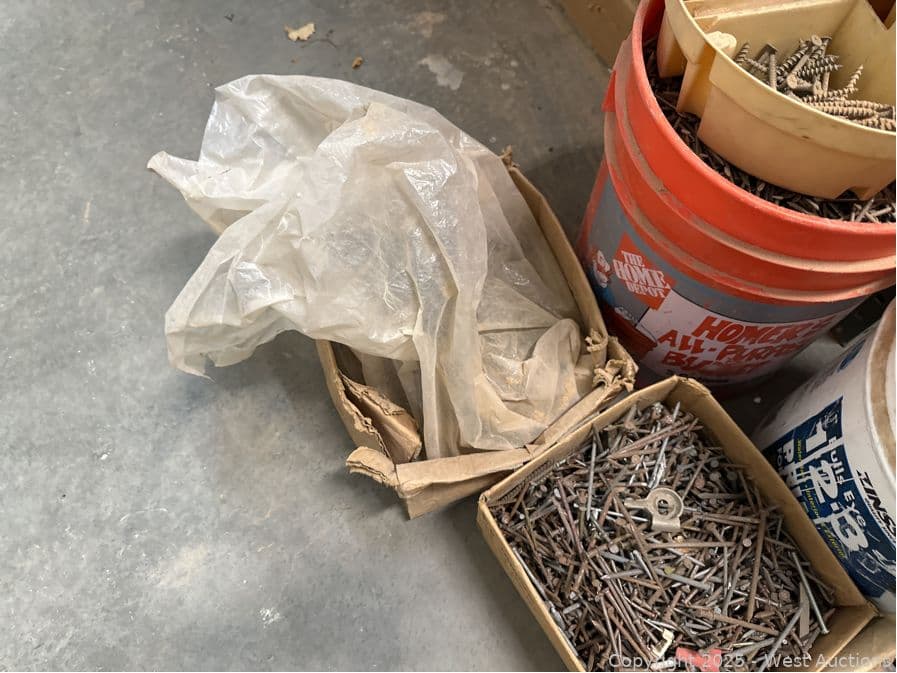 (7) Boxes And Buckets Of Nails, Concrete Tools, and More | West Auctions