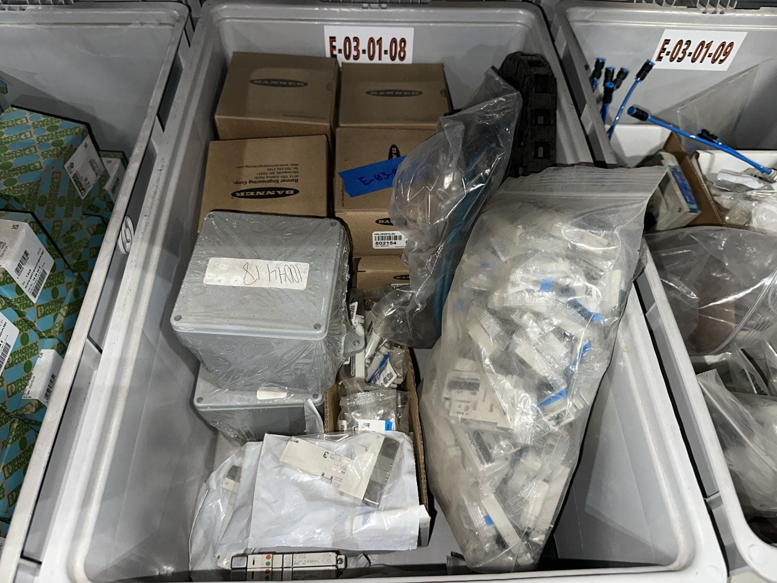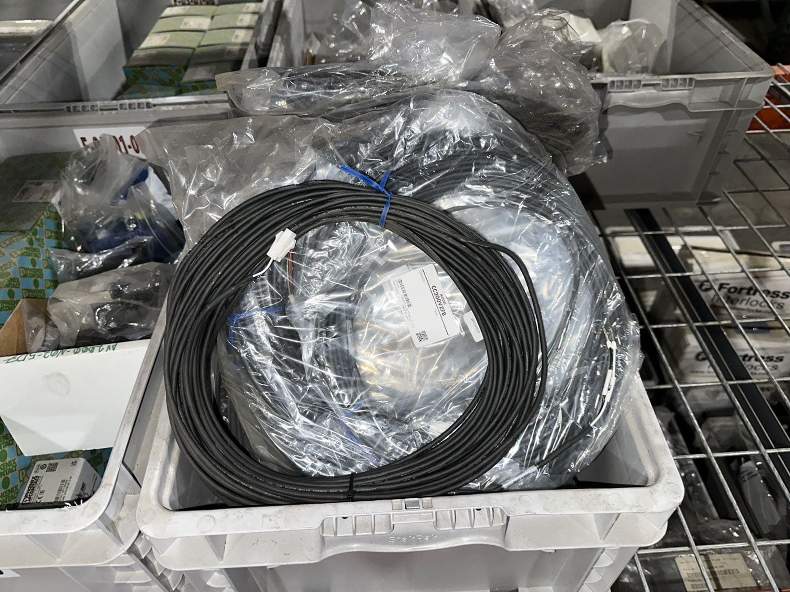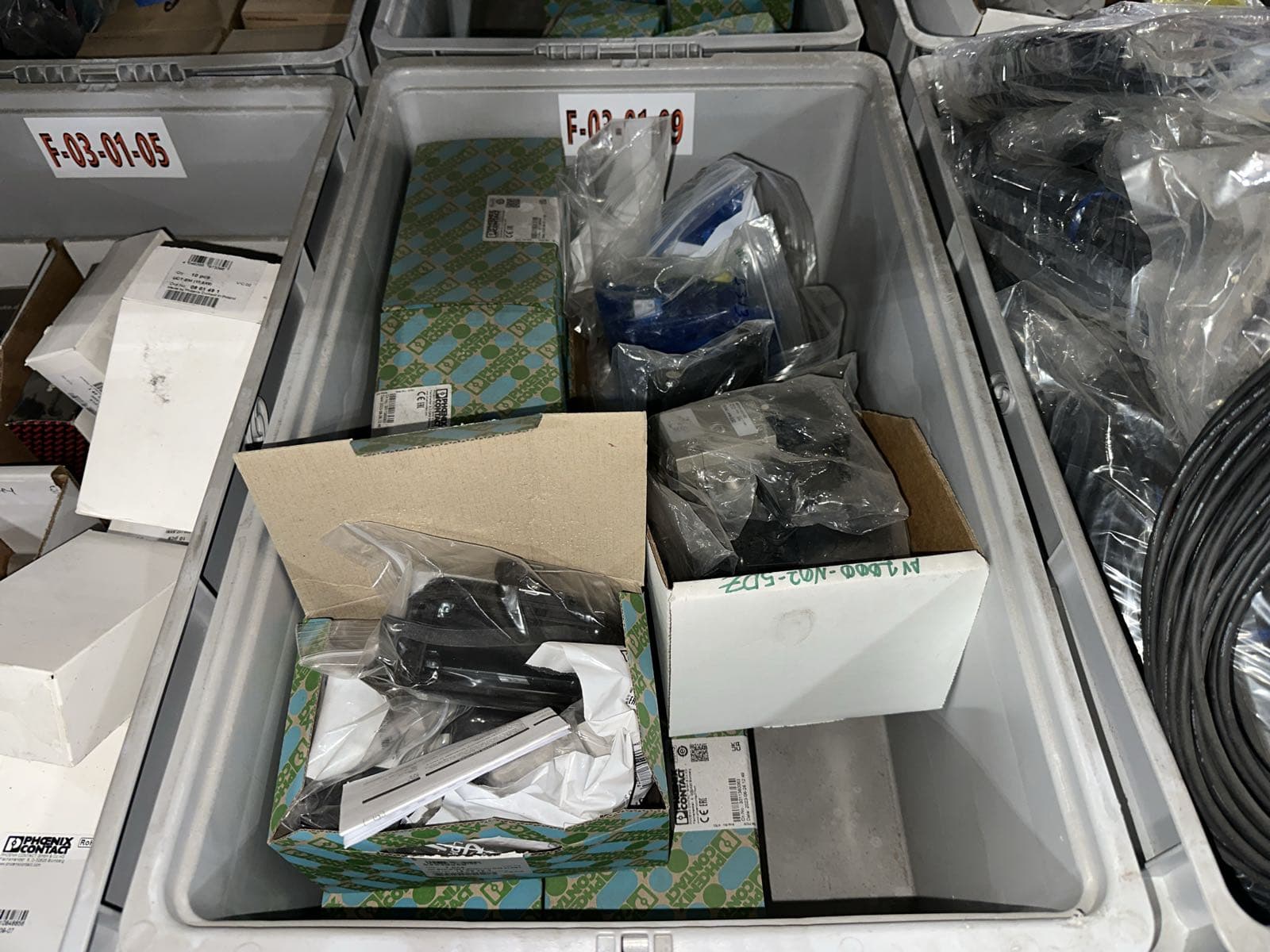 Contents Of (7) Bins: Electrical Boxes, Hybrid Motor Starters, Igus Hardware, FANUC Robotics Cables, And More (Bins NOT Included) | West Auctions