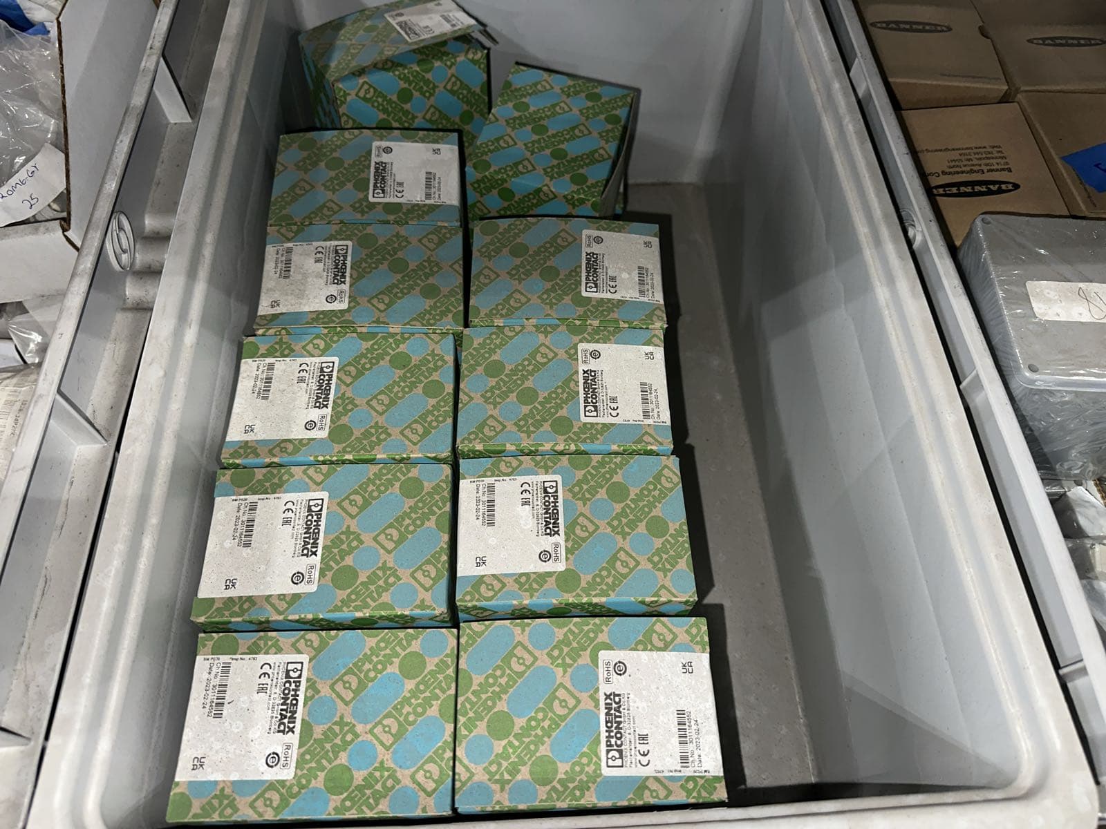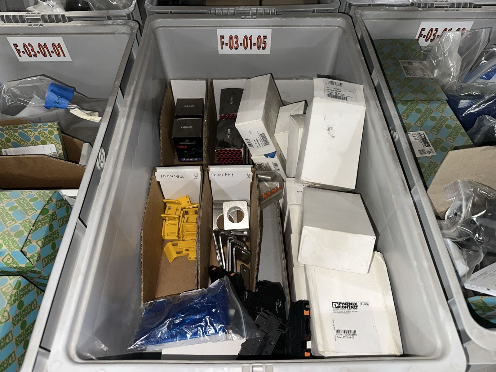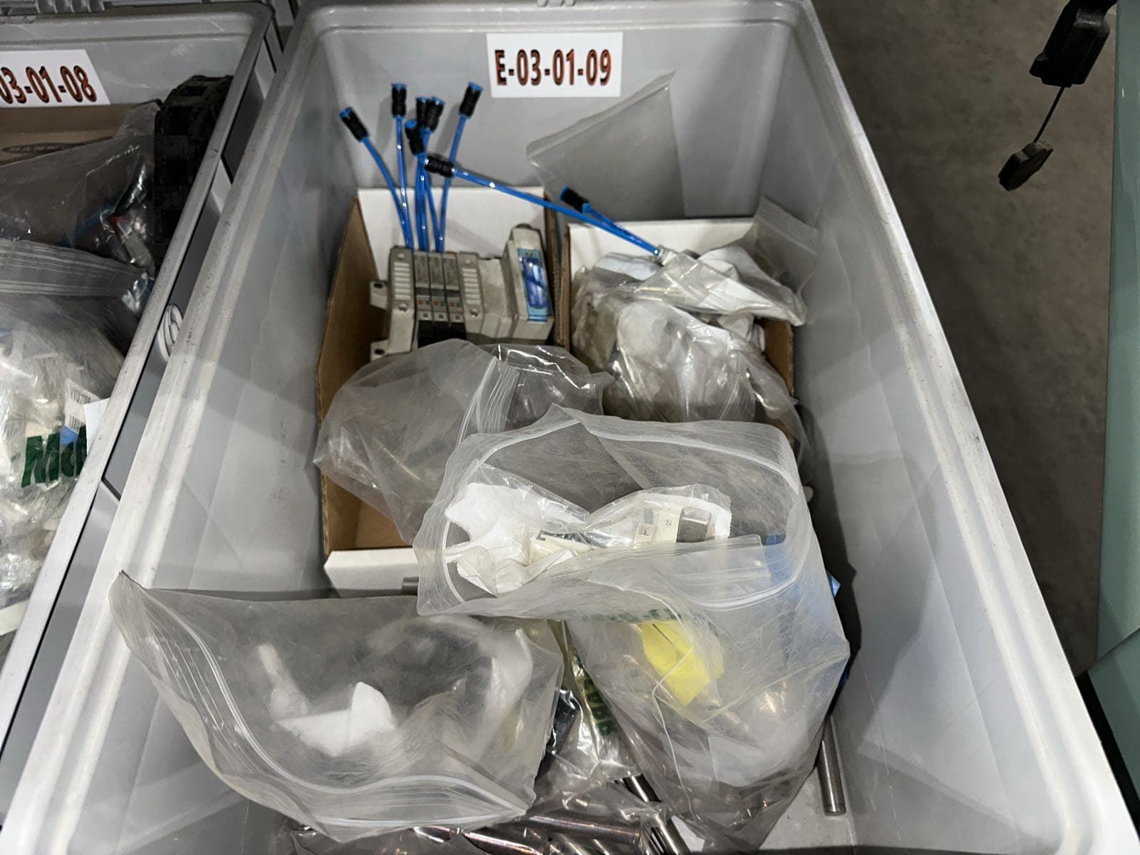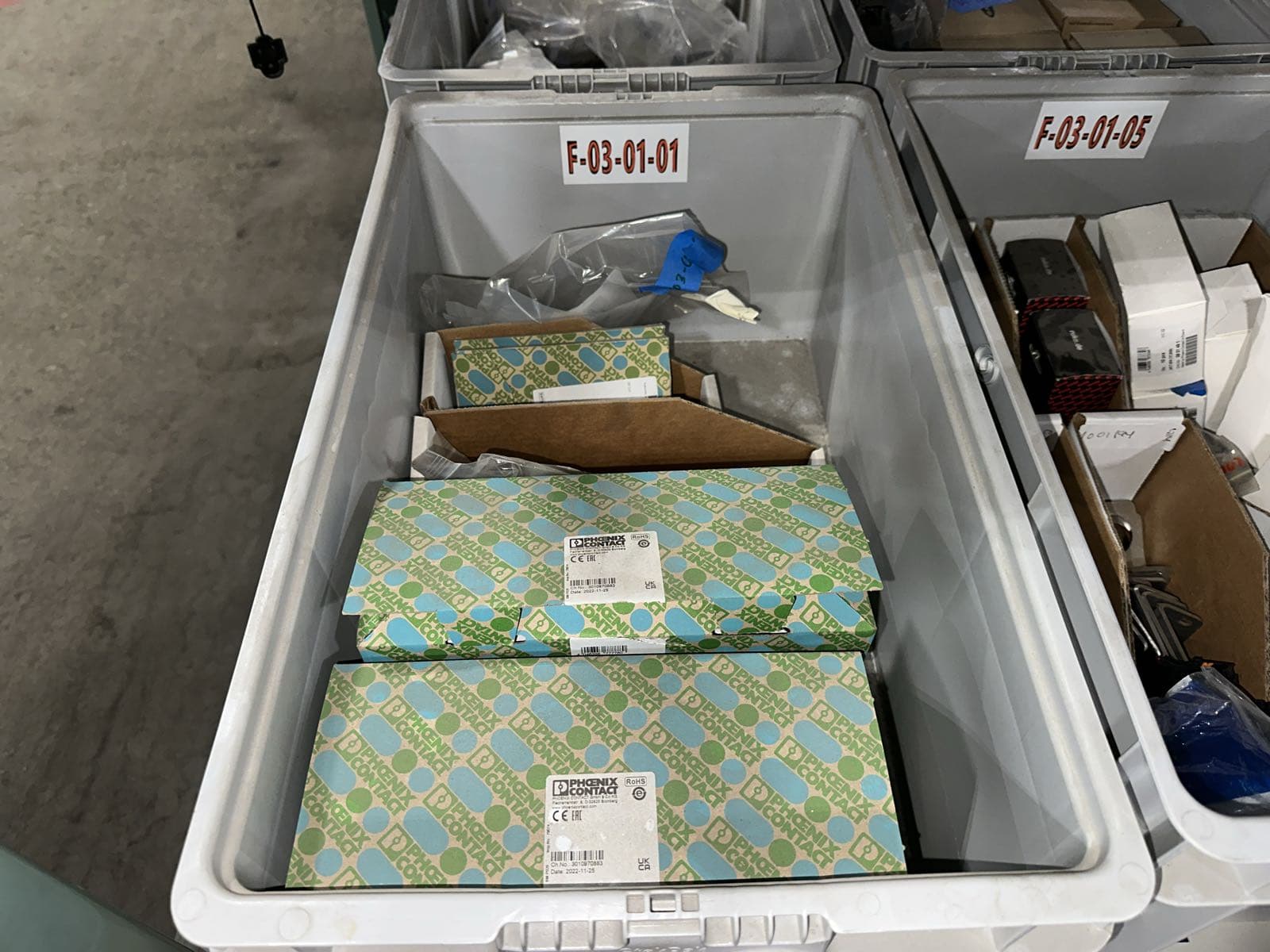 Contents Of (7) Bins: Electrical Boxes, Hybrid Motor Starters, Igus Hardware, FANUC Robotics Cables, And More (Bins NOT Included) | West Auctions