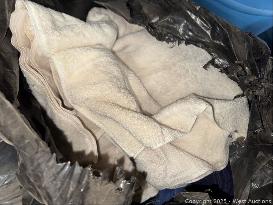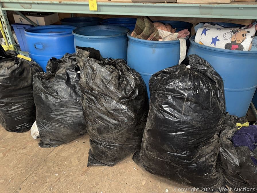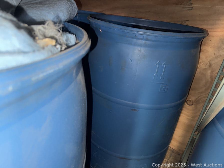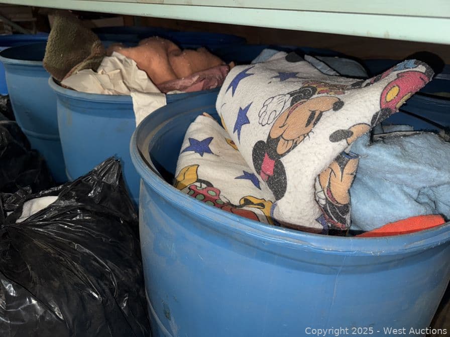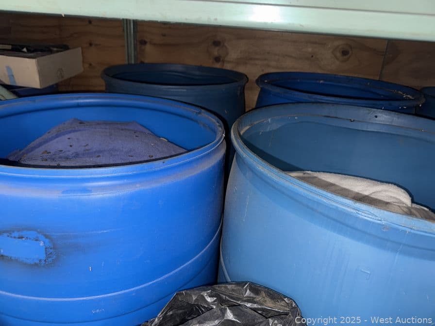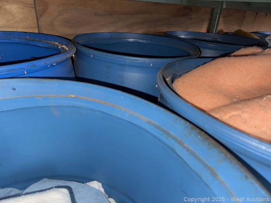 Contents Of Bottom Shelf: (8) 55 Gallon Drums With Blankets And Towels | West Auctions