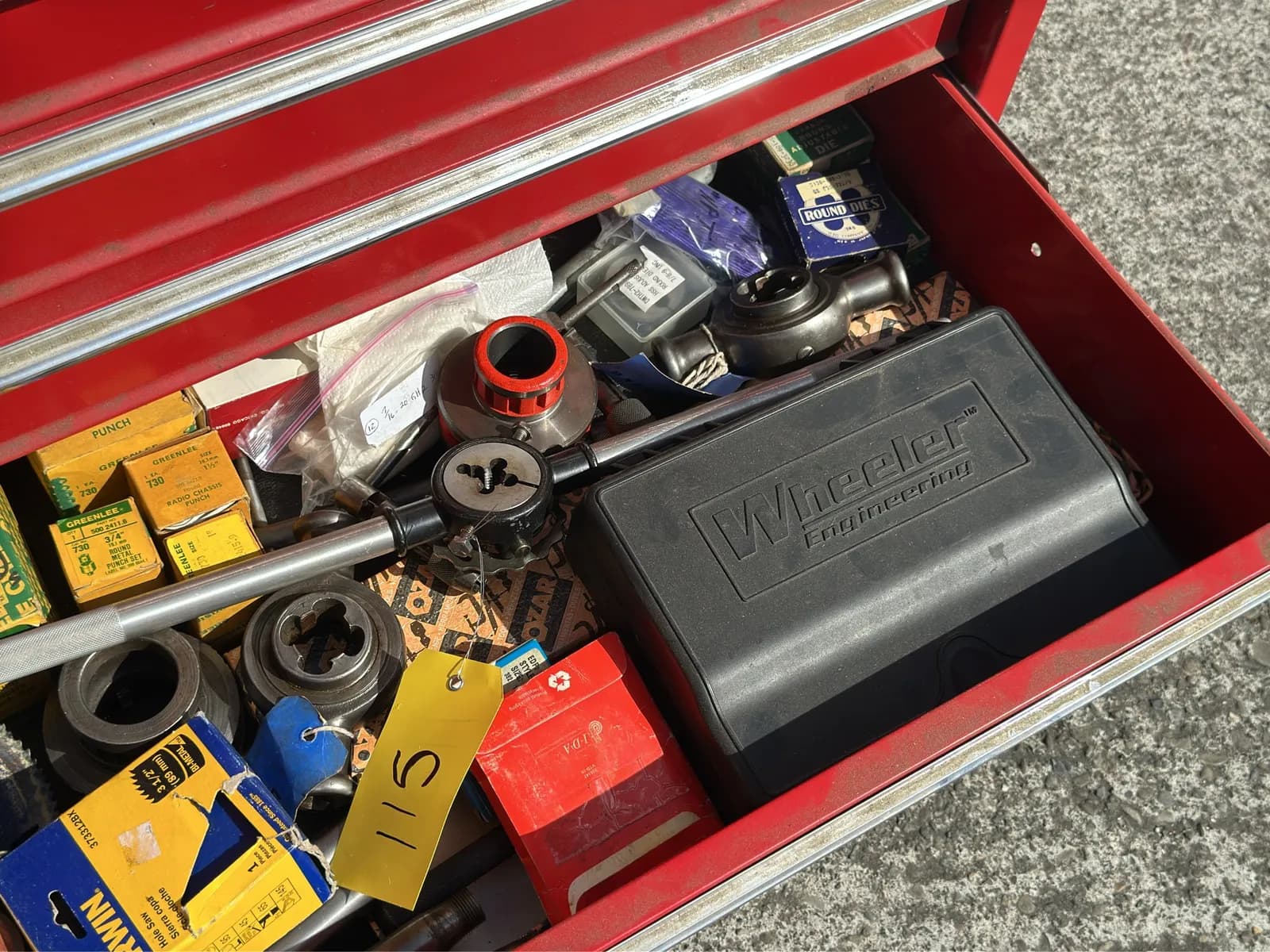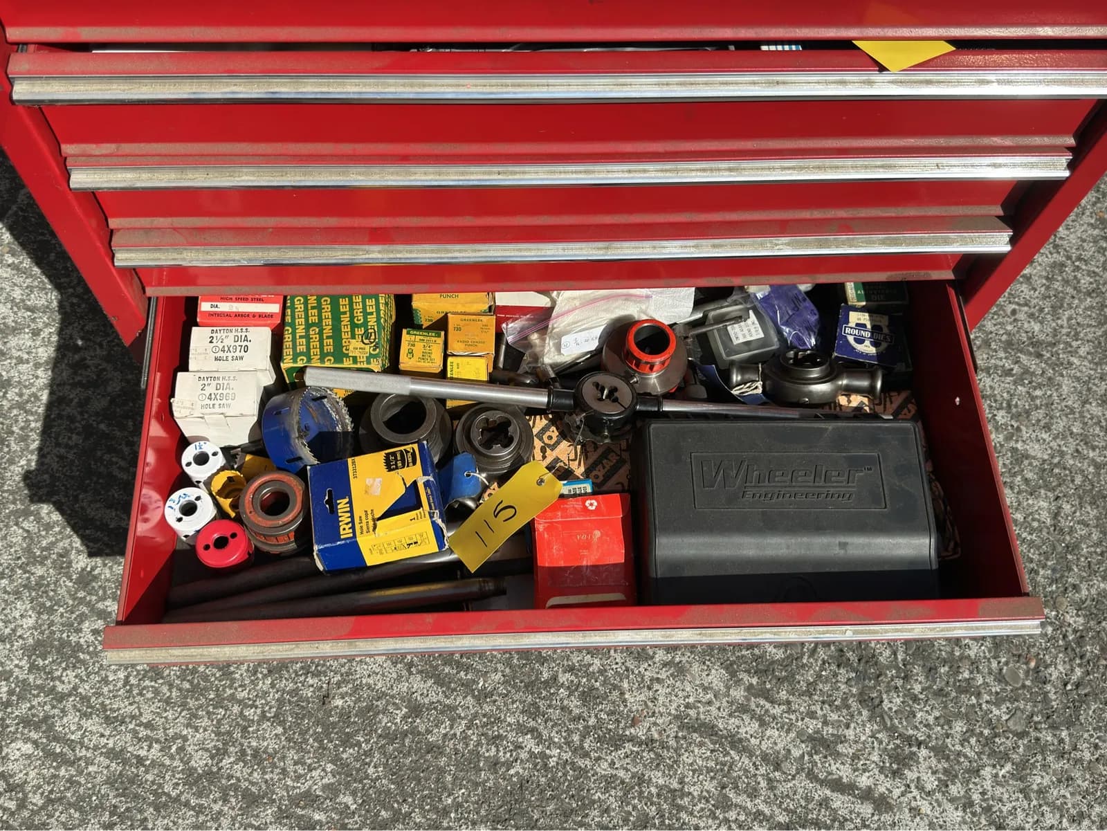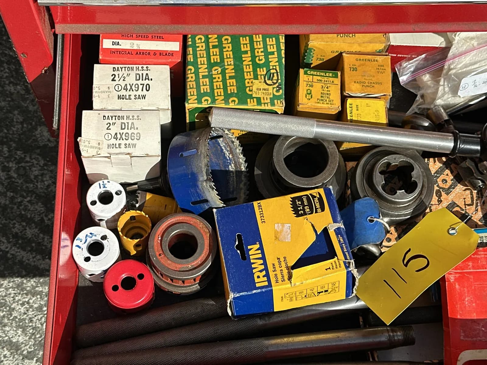 Contents Of Drawer: Assorted Hole Saw Bits, Punch Sets, Round Dies, And More | West Auctions