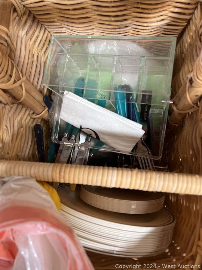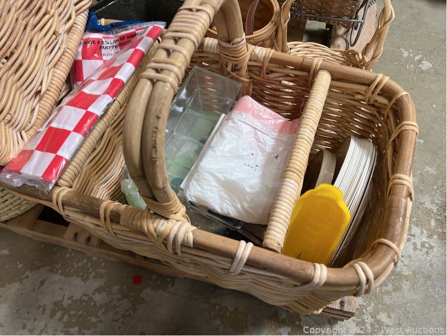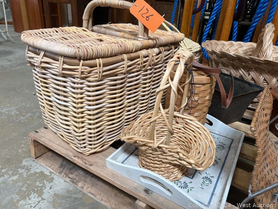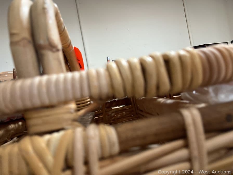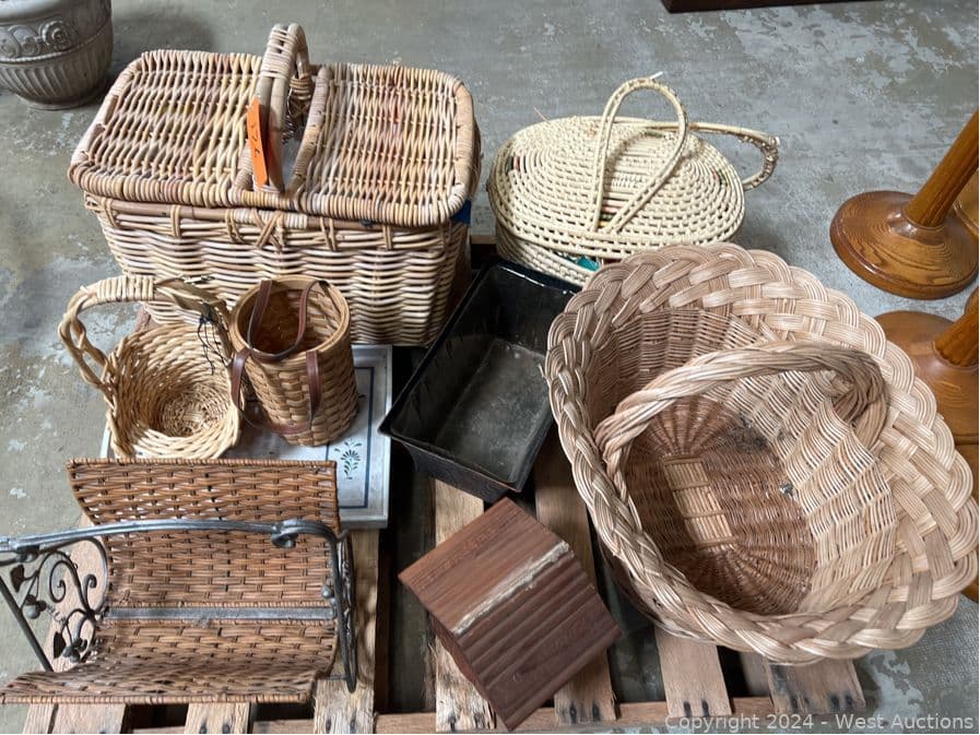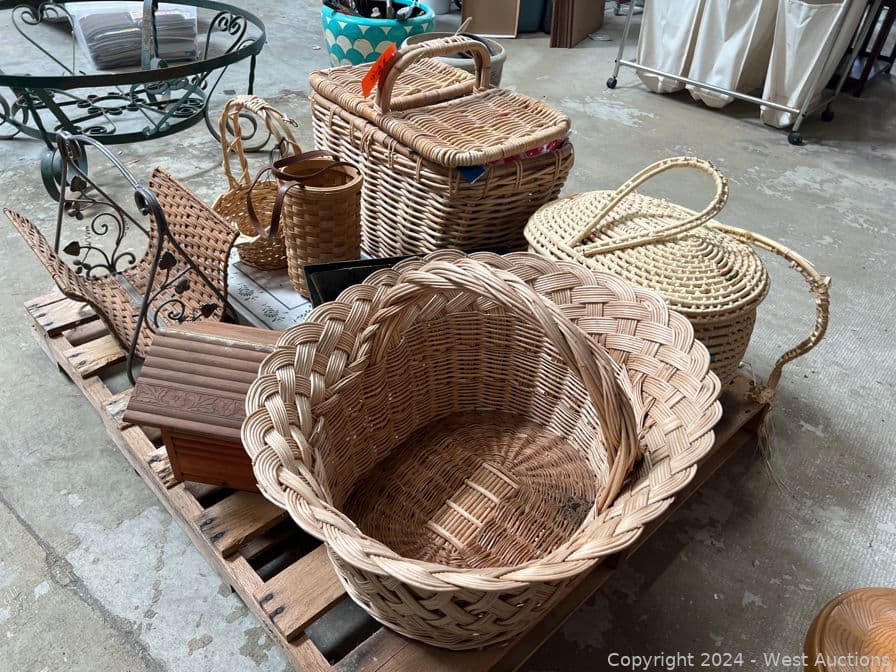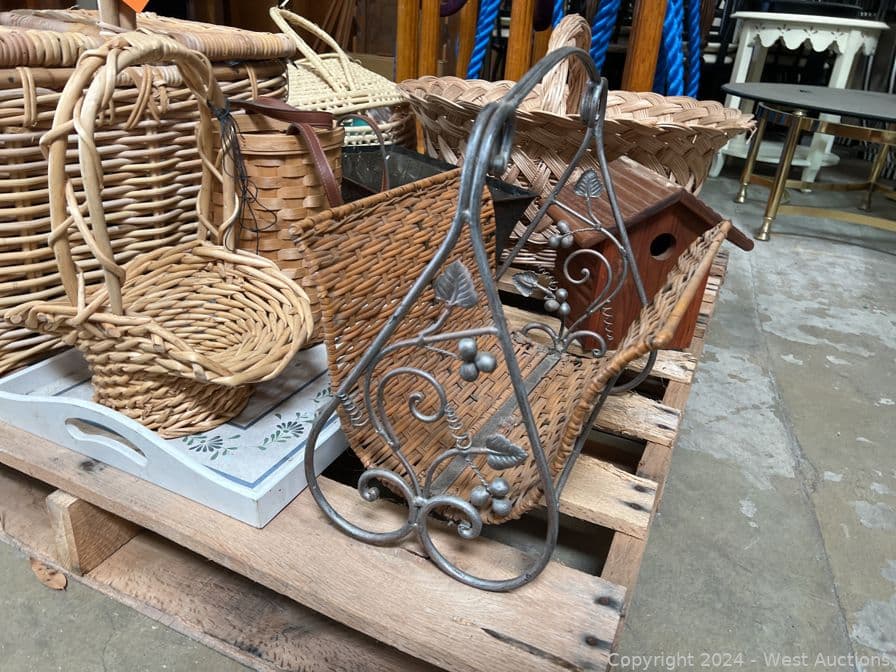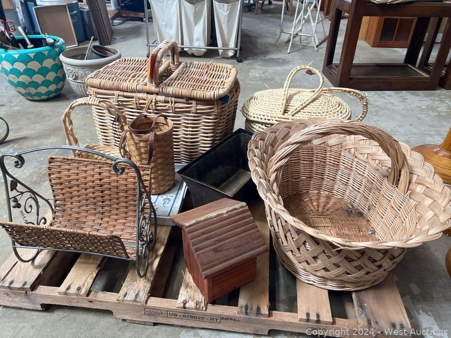 Contents of Pallet: Woven Wicker Items, Baskets, Birdhouse and More | West Auctions