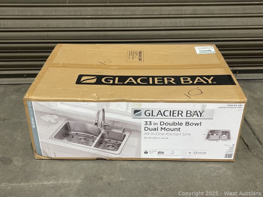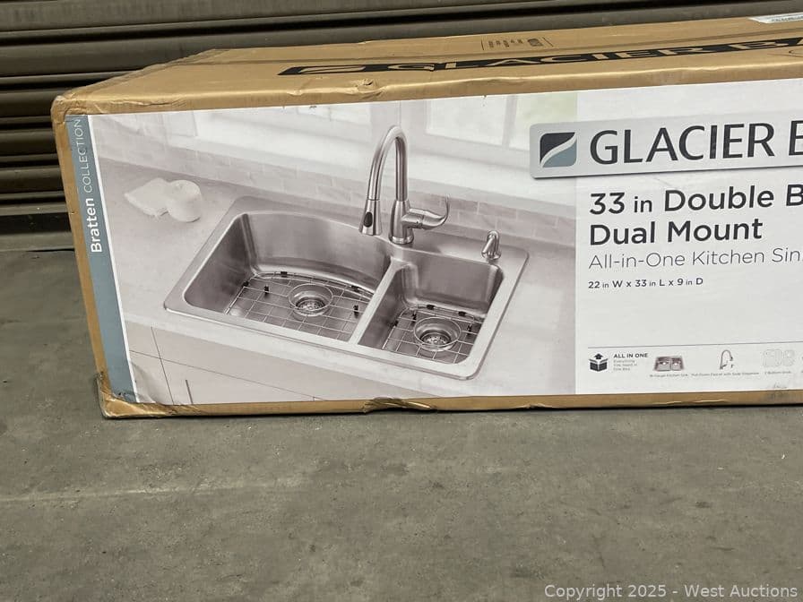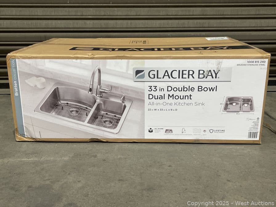 Glacier Bay Bratten 33 in. Drop-In 60/40 Double Bowl 18 Gauge Stainless Steel Kitchen Sink with Pull-Down Faucet- $339 Retail Price | West Auctions