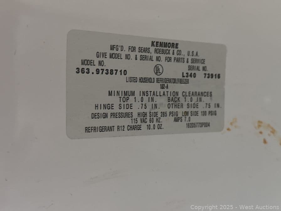 Kenmore Refrigerator/Freezer Model 363.9738710 | West Auctions