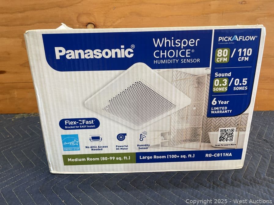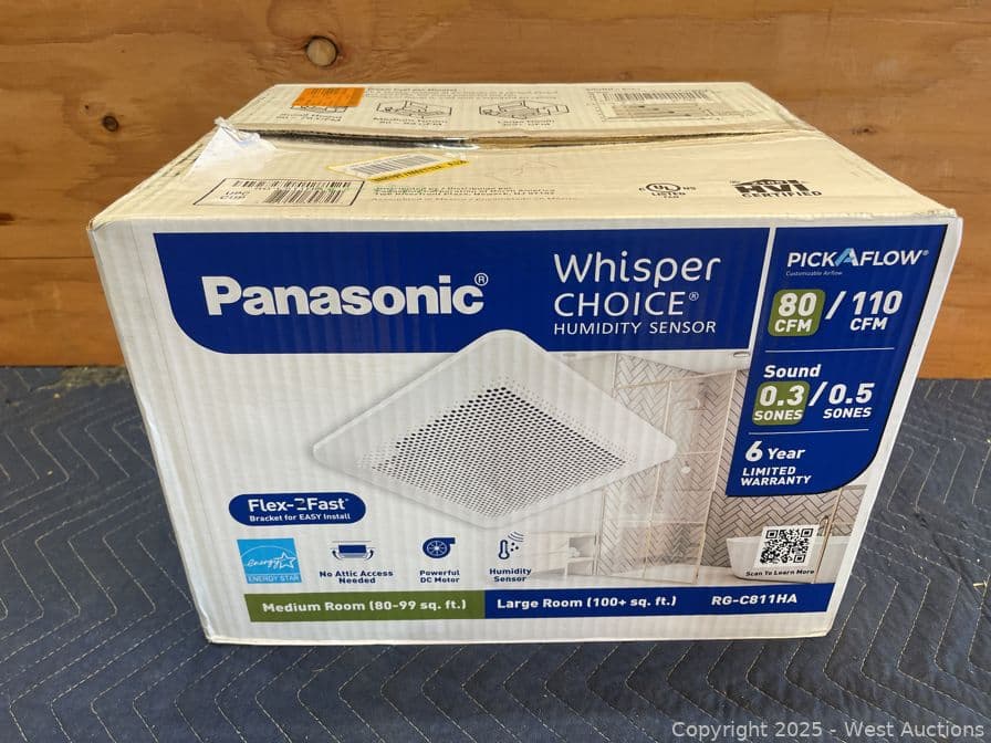 Panasonic Whisper Choice Auto DC Pick-A-Flow 80/110 CFM Ceiling Bathroom Exhaust Fan with Humidity Sense and Flex-Z Fast Bracket- $185 Retail Price | West Auctions