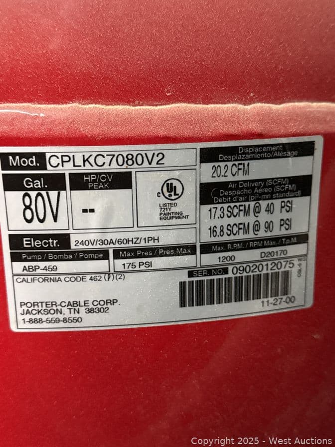 Porter Cable Jet stream Air Compressor 175psi 80 Gallon | West Auctions