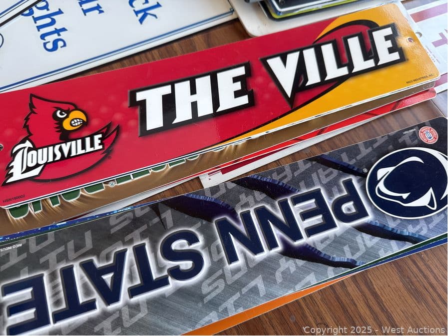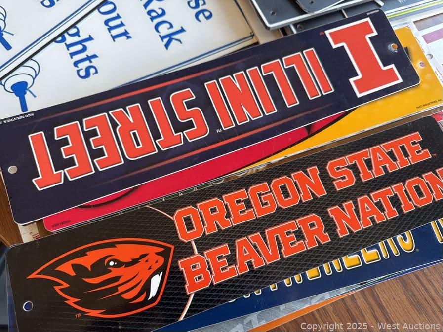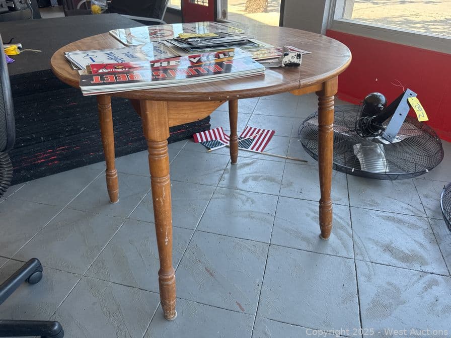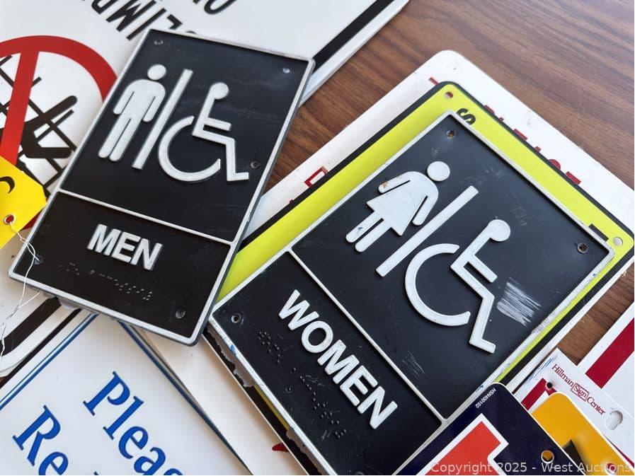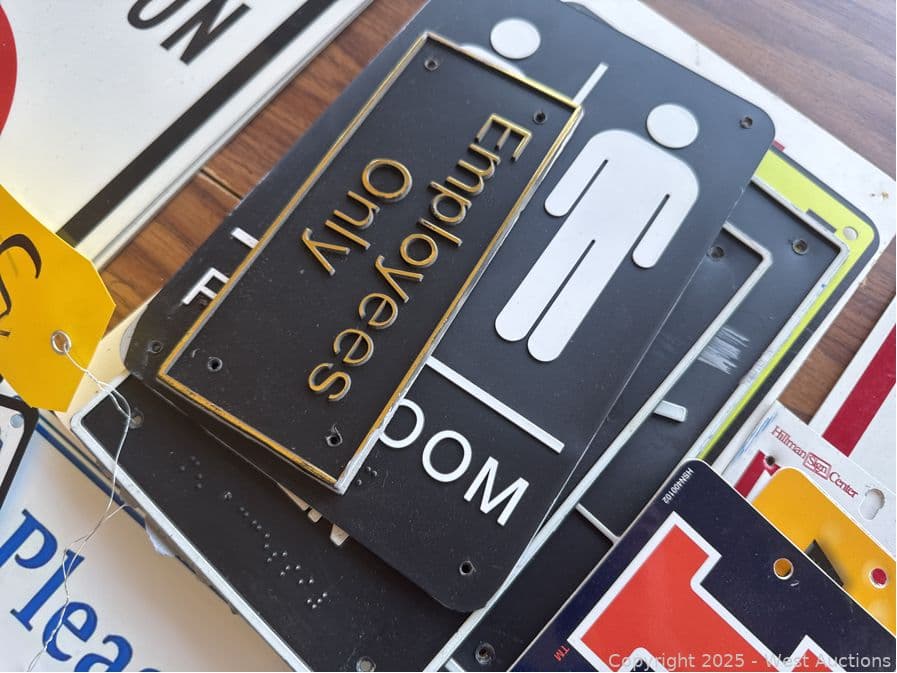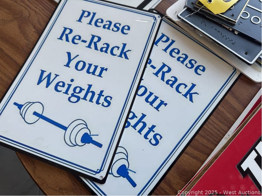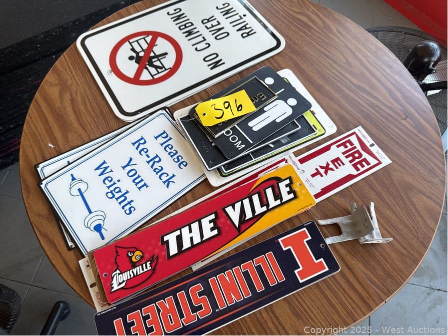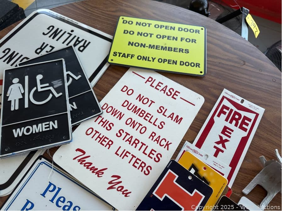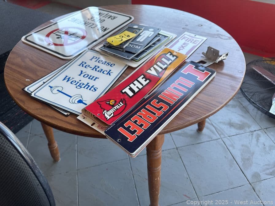 Round Wood Table With Assorted Signage: Gym Related, Restroom, Fire Extinction And More | West Auctions
