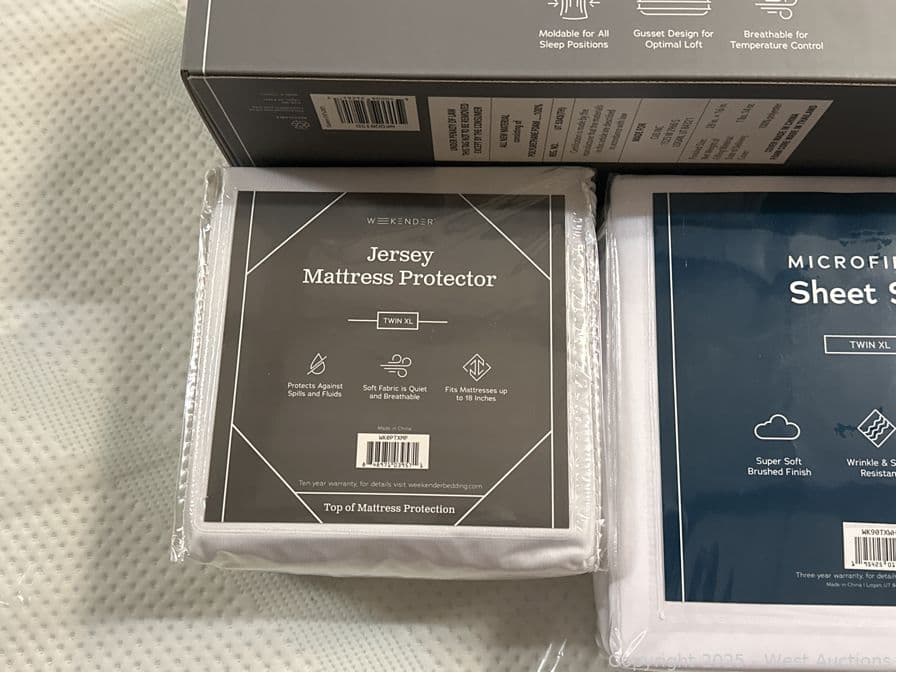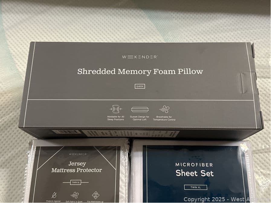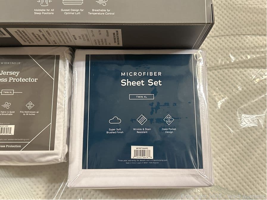 Shredded Memory Foam Pillow (Queen), Jersey Mattress Protector (Twin XL), and Microfiber Sheet Set (Twin XL) | West Auctions